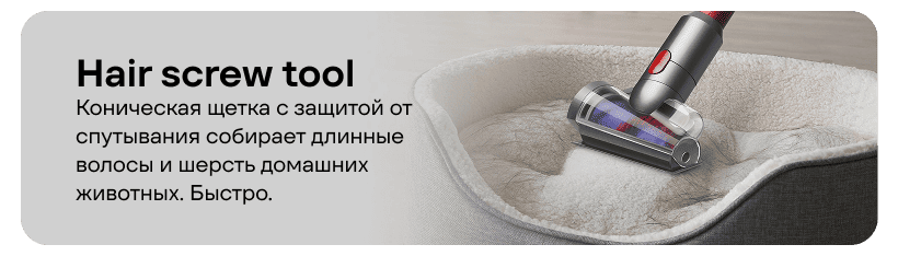 Для более целенаправленной очистки в комплекте поставляется инструмент Hair screw tool, который кардинально меняет ситуацию. Он специально разработан с использованием технологии против запутывания, чтобы справляться с волосами на обивке мебели и лестницах. Инструмент всасывает волосы и спирально направляет их прямо в мусорный бак, эффективно предотвращая их обмотку вокруг инструмента и обеспечивая непрерывный и эффективный сбор.