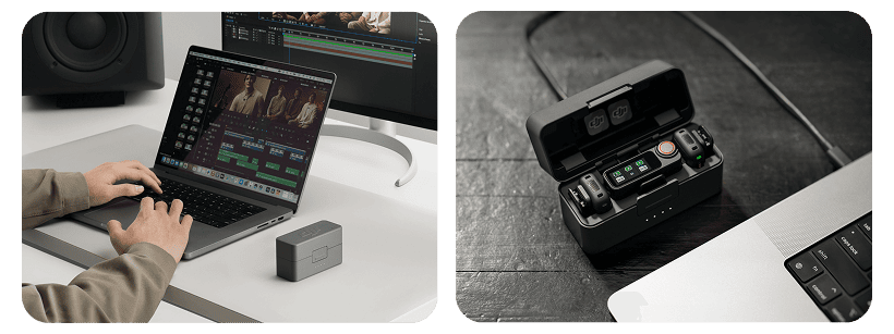 Mic 3 поддерживает высокоточный таймкод. После записи вы можете рассчитывать на беспроблемный экспорт файлов. После съемки просто используйте зарядный чехол и USB-C кабель для подключения обоих передатчиков к компьютеру или смартфону. Редактирование и последующее совместное использование также очень быстрое и простое, все внутренне записанные файлы будут переданы одновременно. Вы также можете подключить передатчик к приложению DJI Mimo и загрузить соответствующие аудиофайлы.
