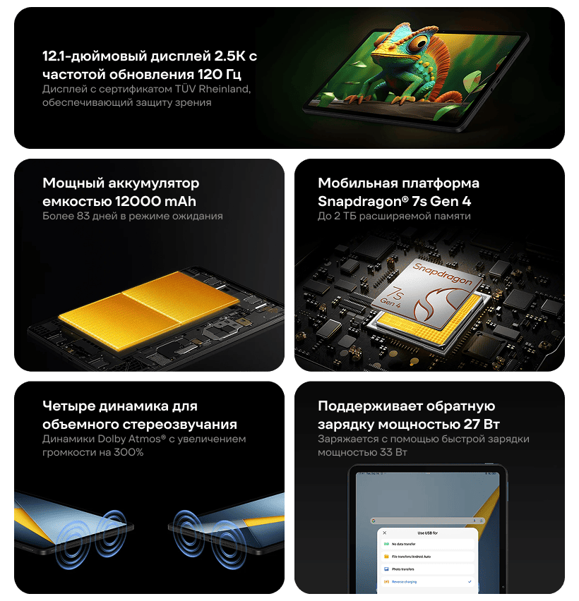 Центральным элементом POCO Pad M1 является его большой 12.1-дюймовый дисплей с кристально чистым разрешением 2.5K. Этот экран создан для полного погружения в изображение, обеспечивая четкую детализацию и поразительно яркие изображения. Благодаря поддержке более 1.07 миллиарда цветов, изображения обладают замечательной глубиной и нюансами. Включение Dolby Vision еще больше усиливает это зрелище, обеспечивая воспроизведение кинематографического контента с потрясающим динамическим диапазоном и контрастом, превращая каждый фильм и видео в незабываемое событие.