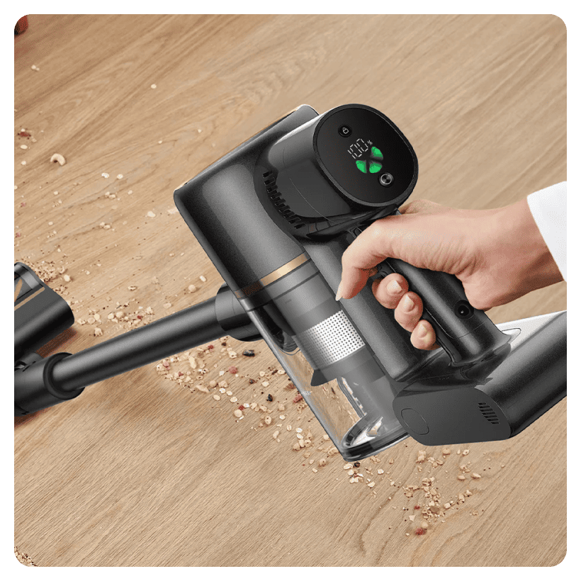 Простота использования имеет первостепенное значение, и Dreame R10S Pro оснащен четким светодиодным экраном для интуитивного управления. Этот дисплей предоставляет информацию в режиме реального времени о состоянии батареи и выбранном режиме уборки. Простым касанием вы можете переключаться между режимами Eco, Med и Turbo. Это позволяет вам настроить мощность всасывания и использование батареи в соответствии с поставленной задачей, будь то быстрая ежедневная уборка или глубокая чистка.