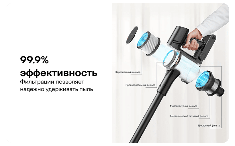 Пылесос должен улавливать пыль, а не возвращать ее в воздух. В R10S Pro используется усовершенствованная многоконусная система фильтрации, которая обеспечивает 99.9% эффективность улавливания мелких частиц пыли. Система сначала отделяет крупные частицы мусора, направляя их в мусорный бак, а затем тщательно фильтрует воздух через несколько слоев. Это гарантирует чистоту выходящего воздуха, что делает его отличным выбором для домохозяйств, в которых проживают люди, страдающие аллергией или астмой.