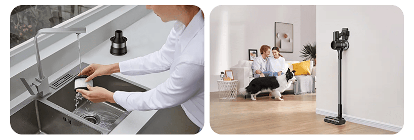 Обслуживание Dreame R10S Pro простое и гигиеничное. Контейнер для пыли оснащен механизмом удаления одним нажатием, что позволяет высыпать собранную грязь прямо в мусорное ведро с минимальным контактом. Для долгосрочного обслуживания ключевые компоненты, такие как роликовая щетка и главный фильтр, можно полностью мыть. Просто промойте их водой, дайте высохнуть и установите обратно, что поможет сохранить производительность и гигиену пылесоса на протяжении долгого времени. Наконец, Dreame R10S Pro учитывает ваше жилое пространство. Он поставляется с настенным креплением, обеспечивающим удобное и организованное хранение. Повесив пылесос на стену в шкафу или подсобном помещении, вы обеспечите его безопасное хранение и постоянную доступность. Такой подход позволяет сэкономить ценное место на полу и гарантирует, что устройство будет готово к следующему использованию, поддерживая порядок и чистоту в доме.