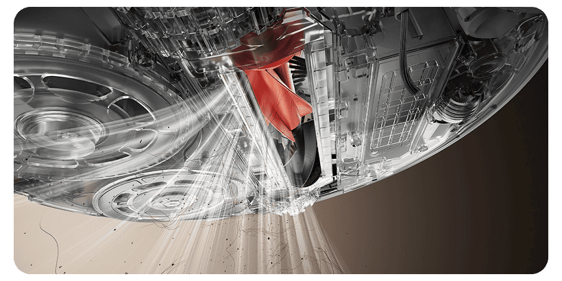 В механизме очистки используются две отдельные щеточные системы, сертифицированные на устойчивость к запутыванию. Основная щетка DuoDivide™ использует два противовращающихся валика, предназначенных для направления волос и волокон к центральному всасывающему отверстию, чтобы минимизировать их запутывание.