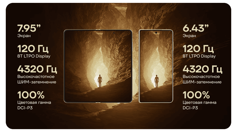 HONOR Magic V5 оснащен передовым 7.95-дюймовым LTPO OLED-дисплеем с частотой обновления 120 Гц, поддержкой 1 миллиарда цветов и максимальной яркостью до 5000 нит. Благодаря технологии Honor Super Armored Inner Screen он предлагает не только потрясающую цветопередачу и плавное движение, но и повышенную устойчивость к повседневной эксплуатации. Внешний 6.43-дюймовый OLED-дисплей с защитным слоем Anti-scratch NanoCrystal Shield обеспечивает идеальную читаемость и плавную реакцию даже при закрытом телефоне. Независимо от того, создаете ли вы, общаетесь или просто смотрите любимый контент, HONOR Magic V5 предоставит вам максимально захватывающий и роскошный визуальный опыт.