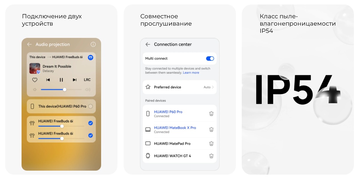 FreeBuds 6i поддерживают двойное подключение к устройствам iOS и Android, совместное использование звука с другими наушниками Huawei, кроме того, они сертифицированы по стандарту IP54 (защита от брызг воды и пыли).